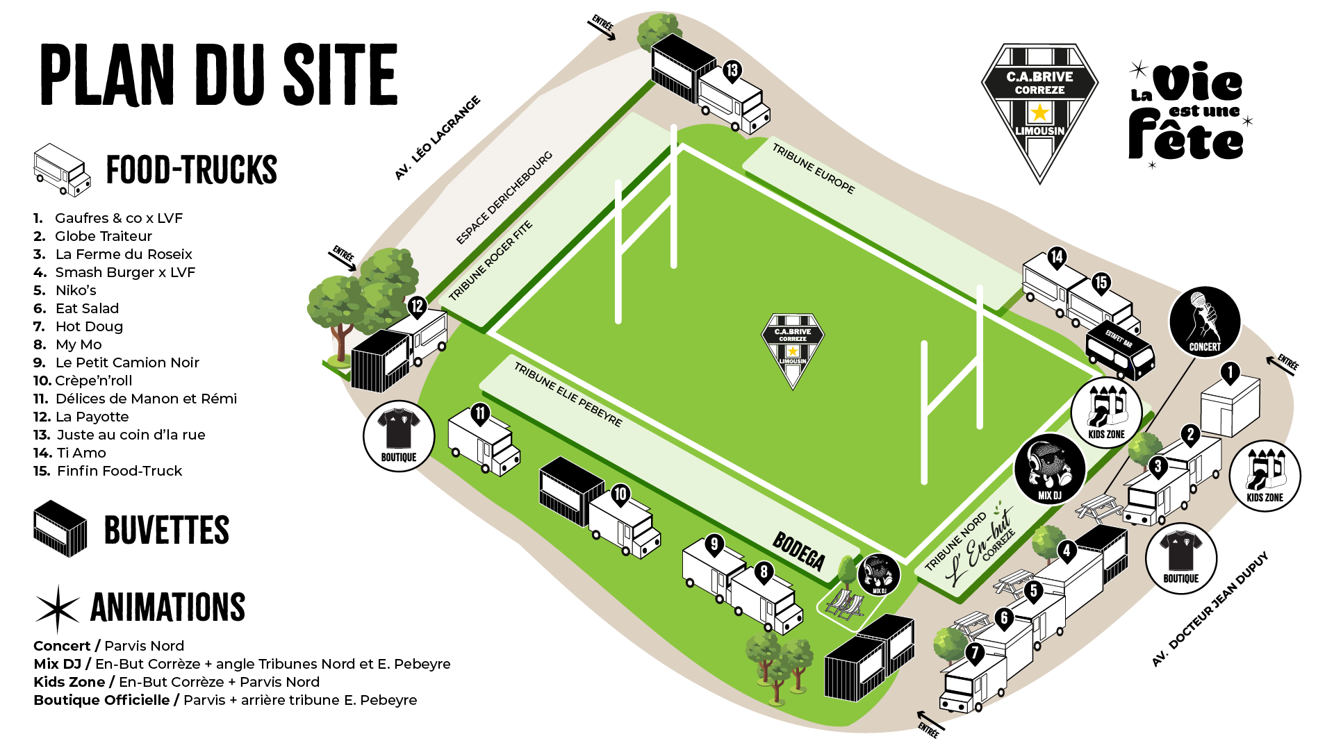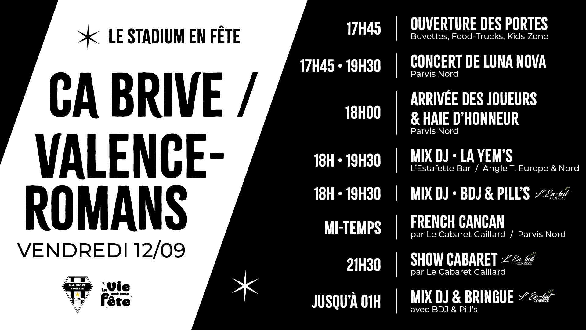 Pour cette nouvelle rencontre à domicile, le CA Brive et la Vie est une Fête s'associent pour faire du Stadium un lieu de vie incontournable. Plus qu'un simple match de rugby, le parvis va devenir un véritable lieu de fête pour tous les supporters Noir et Blanc. Un programme festif et musical à vivre dès l'ouverture des portes, avant, pendant et après le match.