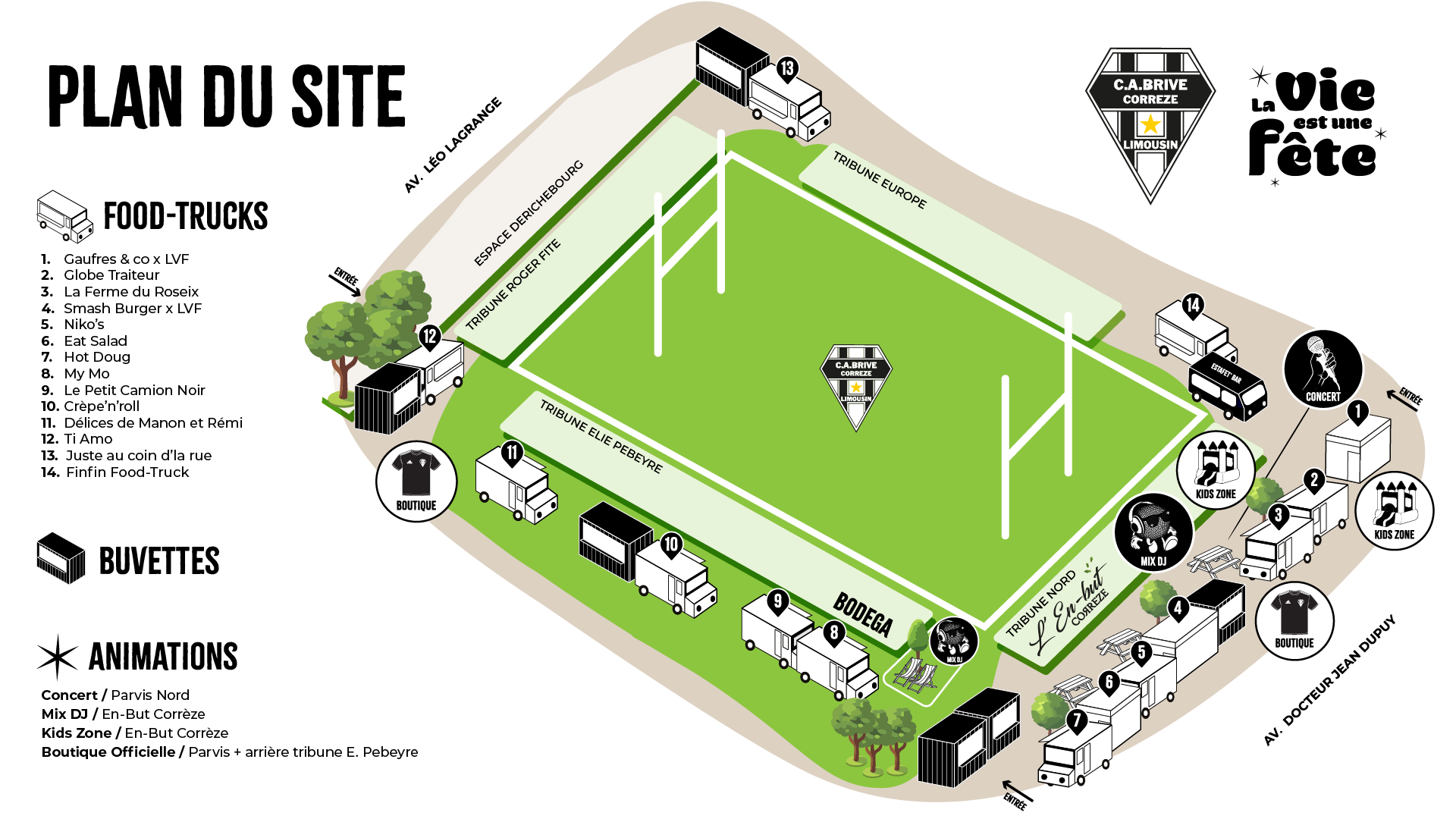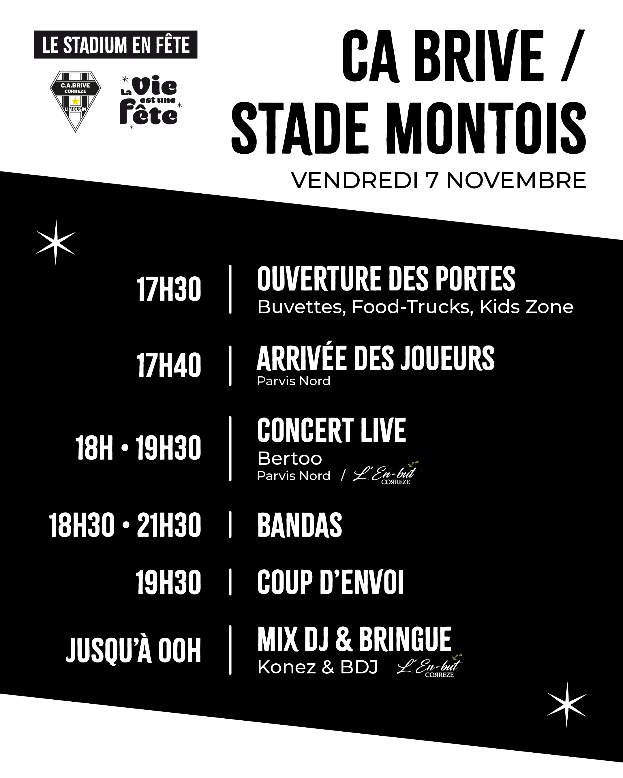 Pour cette nouvelle rencontre à domicile, le CA Brive et la Vie est une Fête s'associent pour faire du Stadium un lieu de vie incontournable. Plus qu'un simple match de rugby, le parvis va devenir un véritable lieu de fête pour tous les supporters Noir et Blanc. Un programme festif et musical à vivre dès l'ouverture des portes, avant, pendant et après le match.